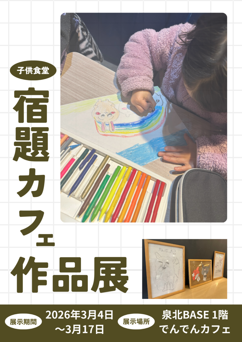 泉北BASEでは、子どもたちが日頃取り組んでいる学びや創作活動の成果を紹介する「宿題カフェ作品展」を、2026年3月4日(水)から17日(火)まで、泉北BASE1Fでんでんカフェにて開催いたします。
